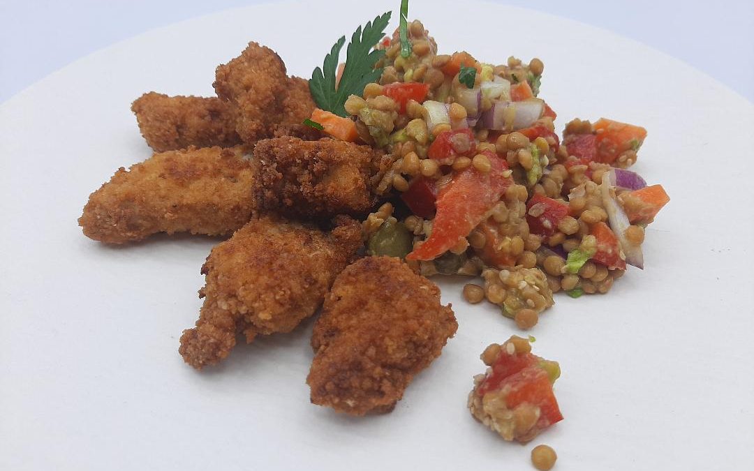 Para la ensalada, escurrir y verter las lentejas en un cuenco.