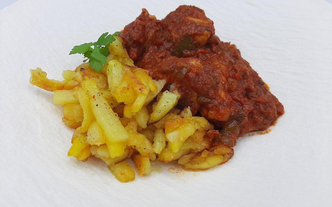 -Para acompañar el pollo, pelar las patatas, cortar en bastones finos, salpimentar y cocinar en una sartén con unas cucharadas de aceite.
