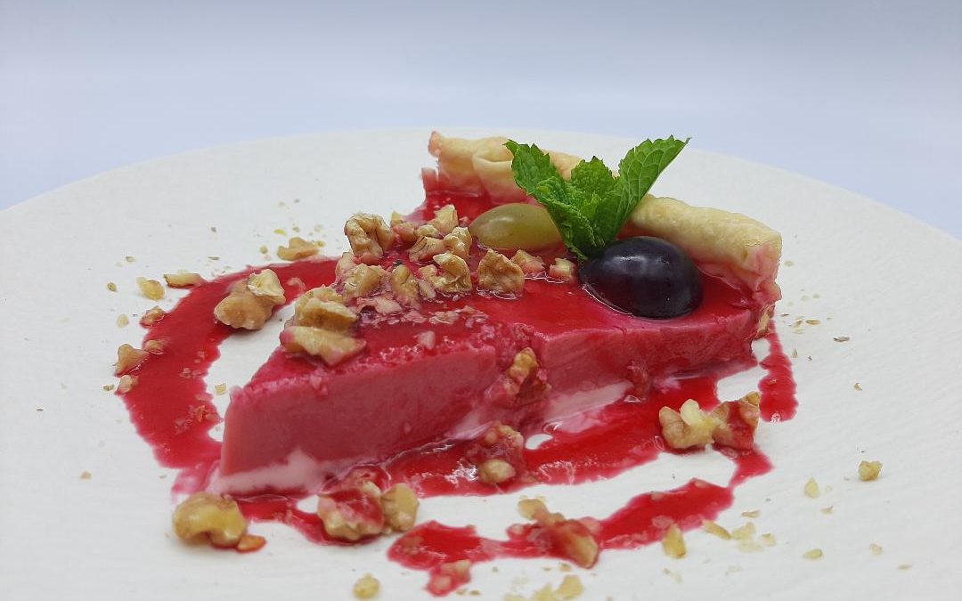 -Sacar la tarta fría y colocar encima las uvas sin semillas cortadas a la mitad. Para evitar que se sequen, si no se va a consumir de inmediato, pintar con una brocha la superficie de las uvas con un poco de miel ligeramente calentada en el microondas. Espolvorear con nueces picadas con el cuchillo.