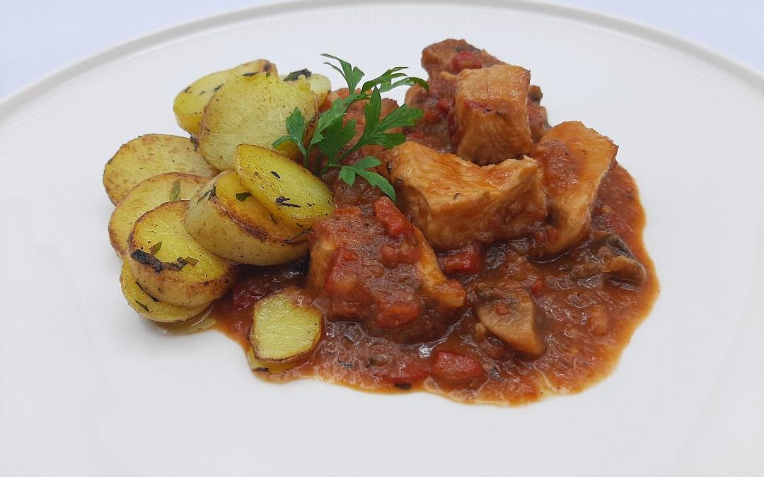 -Trocear la pechuga de pavo en dados de tamaño medio. Salpimentar, enharinar y dorar, a fuego alto, en una cacerola con unas cucharadas de virgen extra. (Es importante que la carne se dore por fuera, pero quede poco hecha por dentro) Apartar y reservar.