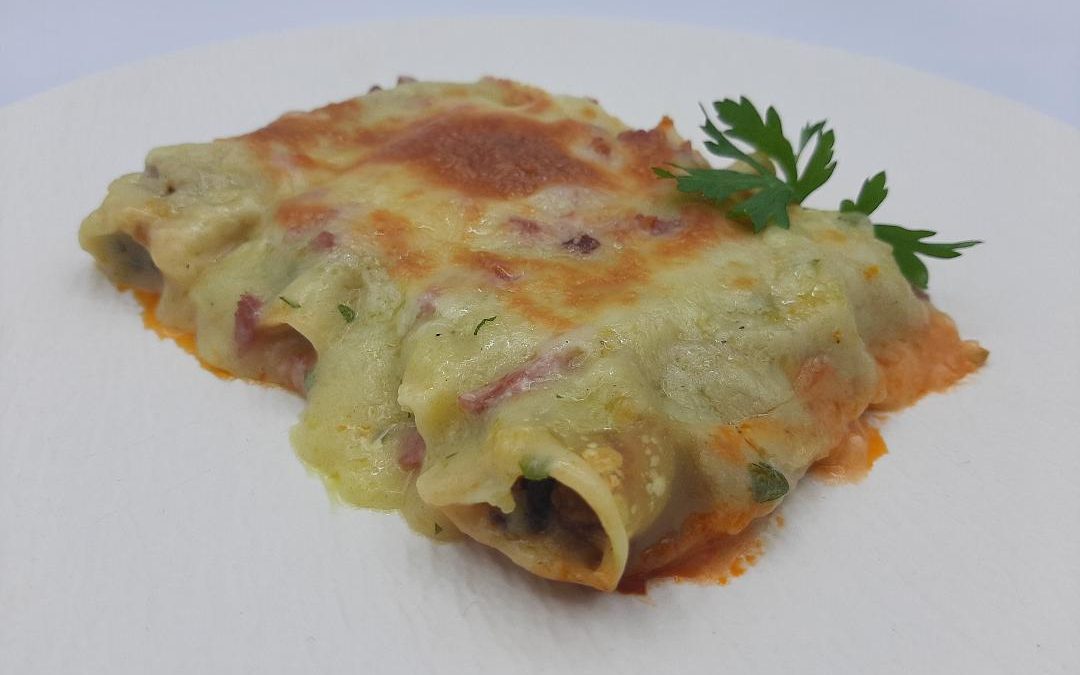-Sacar las láminas de pasta del agua, secar con ayuda de un paño y extender. Disponer relleno encima, liar dándole la forma característica de rulo de canelón y colocar en la fuente.