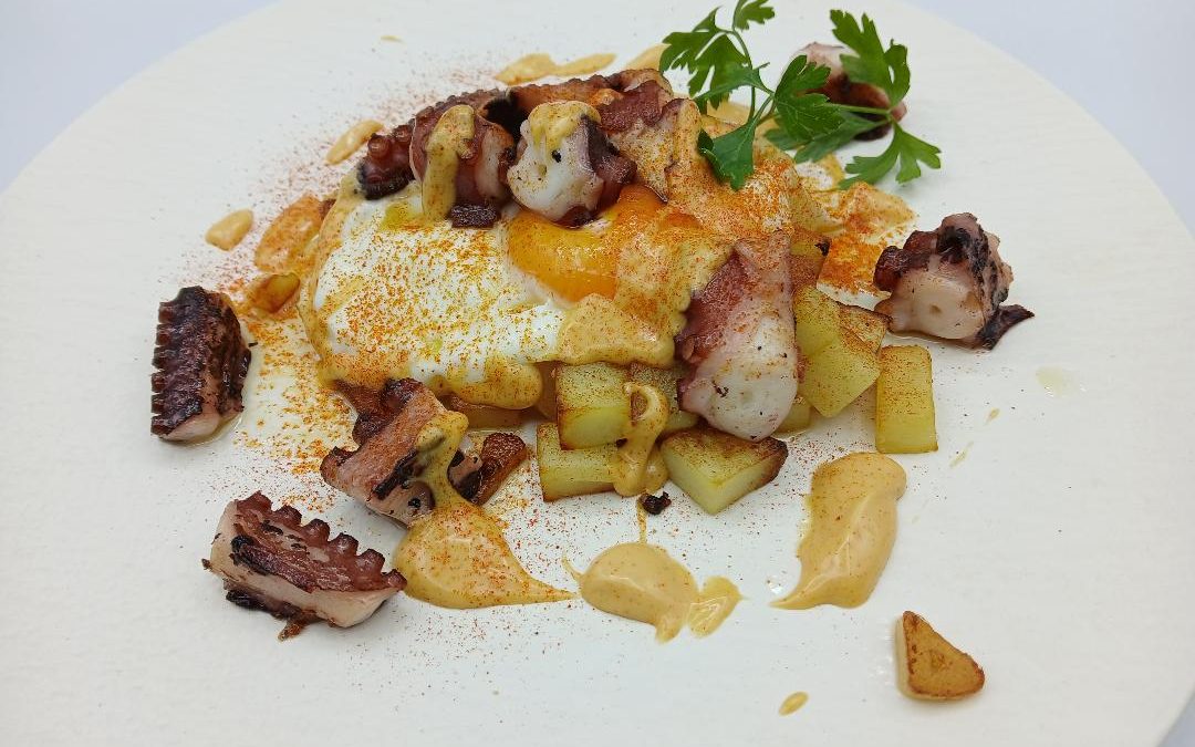 -Presentar el pulpo al ajillo sobre las patatas fritas con huevo y un poco de su propio aceite. Terminar salseando con la mayonesa de pimentón picante y espolvorear con perejil picado y un poco de pimentón.