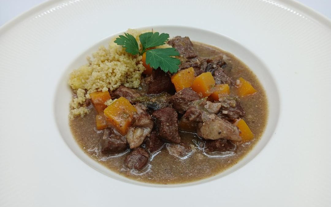 -Para la guarnición, cocinar unos instantes la manzana, pelada y cortada en daditos, en una cacerola con unas cucharadas de aceite. Verter 1 vaso de caldo del guiso y dejar que empiece a hervir. Apagar el fuego, añadir el cous-cous y repartir por la cacerola. Tapar y dejar reposar 5 minutos para que absorba el caldo.