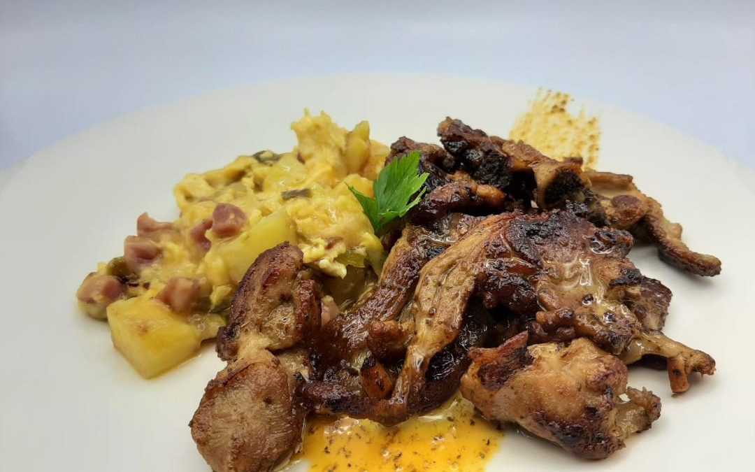 -Justo antes de llevar a la mesa, regar el chivo al ajillo con unas cucharadas del chimichurri que hemos preparado.
