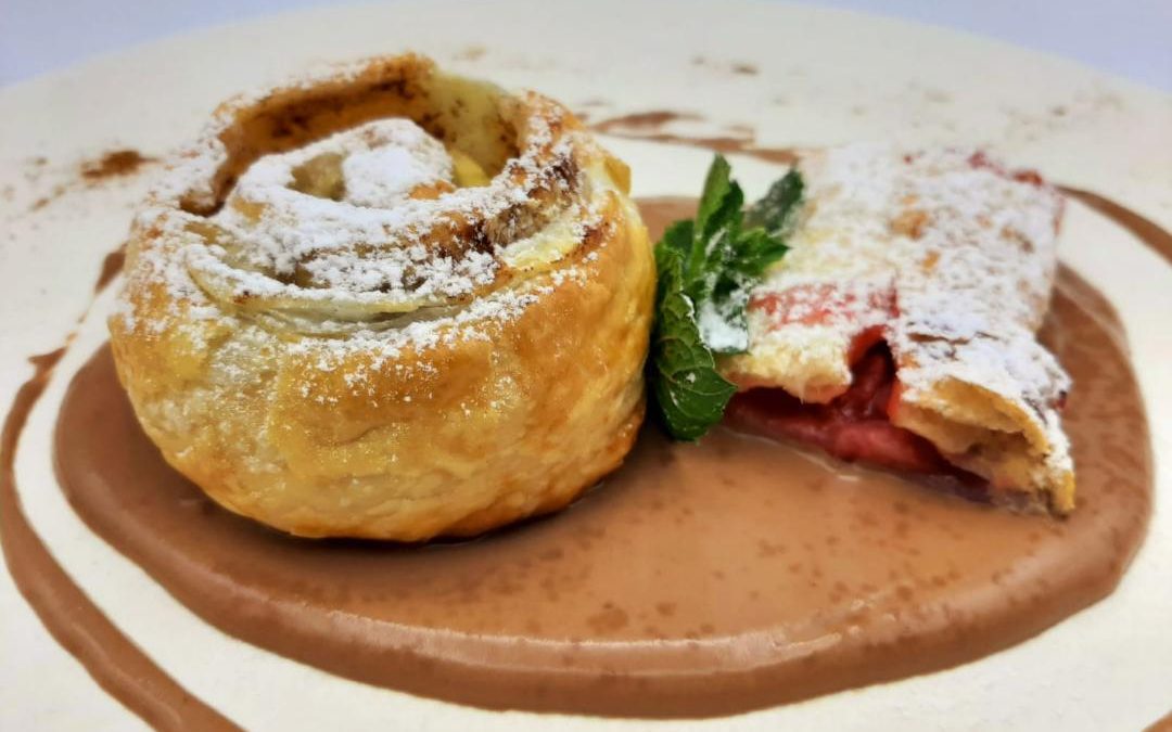 -Cortar el hojaldre de fresas en porciones y llevar a la mesa, junto con el hojaldre de plátano, espolvoreados con azúcar glasé y acompañados de la sopa de chocolate.