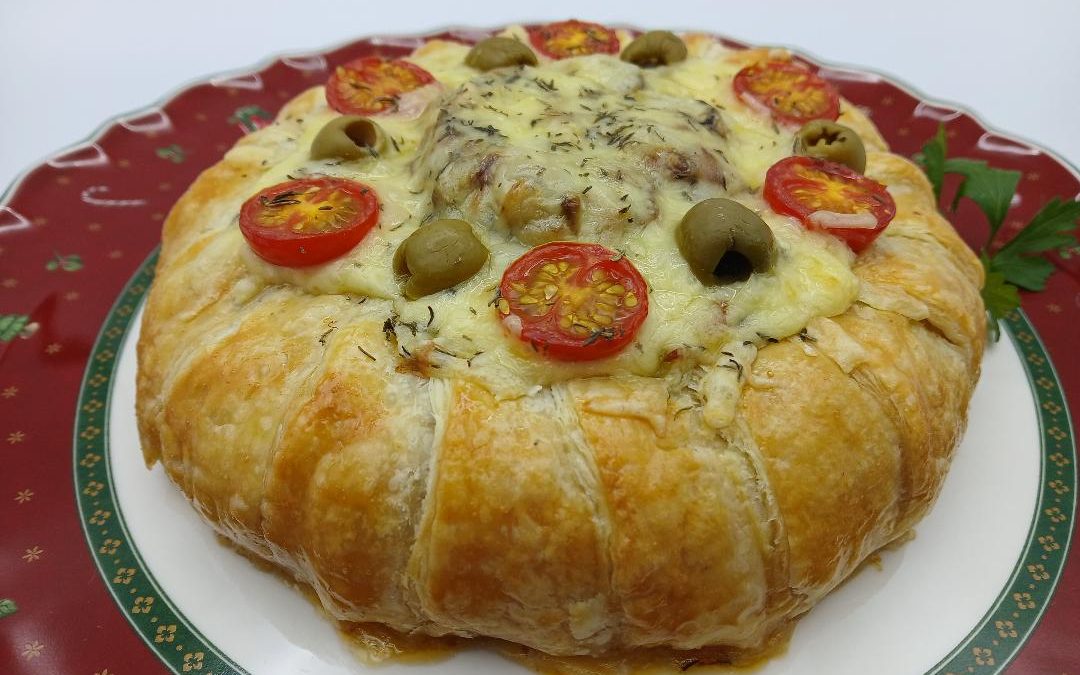 -Sacar del horno y disponer en el medio el sofrito de cebolla y setas. Disponer el queso rallado sobre el centro de la corona de hojaldre, repartir medios tomates cherry y aceitunas alrededor y espolvorear con tomillo seco. Cocinar de nuevo en el horno durante 10 minutos.